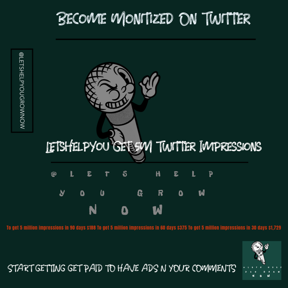NOW YOU CAN MONETIZED YOUR TWITTER WITH ANY PACKAGE YOU CHOOSE THE ONLY DIFFERENCE IS THE MORE YOU PAY THE FASTER THE ORDER OF 5M IMPRESSIONS WILL BE COMPLETED WHILE ALSO IF YOU CHOOSE PACKAGE 2-3 I WILL INCLUDE THE TWITTER COURSE FOR FREE WHERE I SHOW YOU TO GET MORE FOLLOWERS AND HOW TO MARKET ON TWITTER